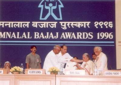 Dr.(Smt.) Indumati Parikh receiving Jamnalal Bajaj Award for the year 1996 from the hands of Shri H.D.Deve Gowda, then Prime Minister of India.