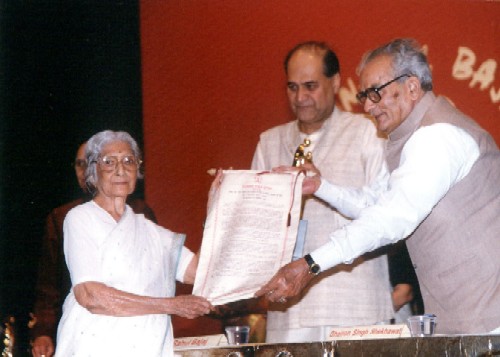 Dr. (Smt.) Chitra Naik receiving the Jamnalal Bajaj Award for the year 2002 at the hands of Shri Bhairon Singh Shekhawat, Vice President (India).