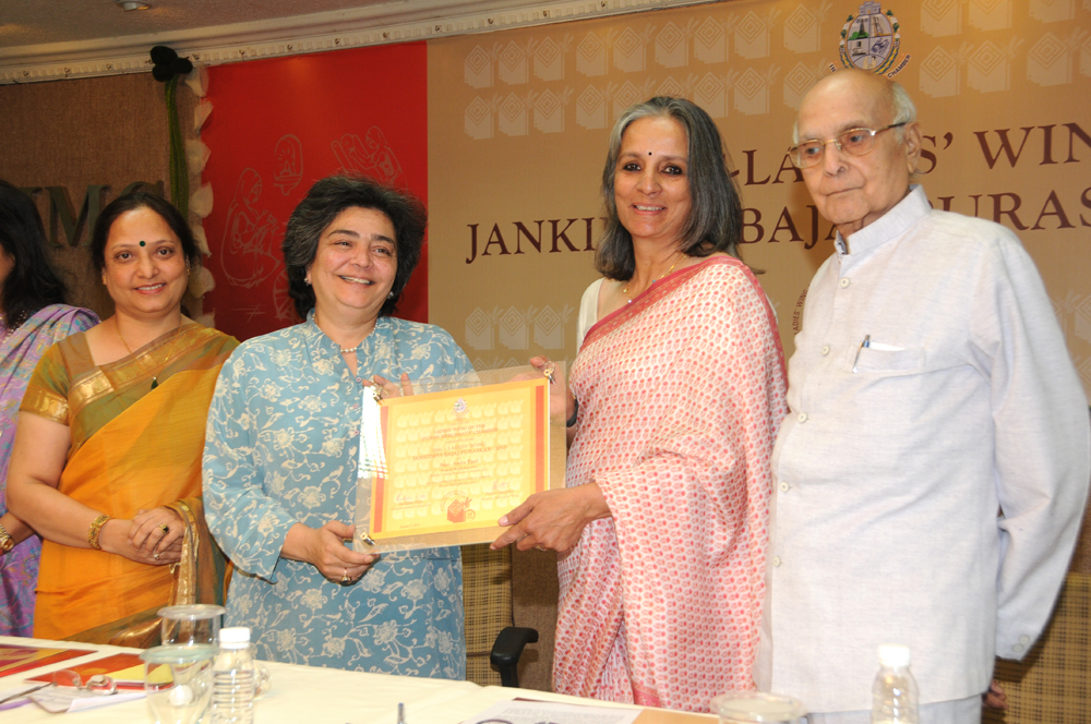 Smt. Anita Paul receiving 18th IMC-LW Jankidevi Bajaj Puraskar-2010 from Smt. Zia Mody. Smt. Smita Dandekar, President, LW-IMC and Justice C.S. Dharmadhikari (Retd.), Chairman Awards Committee, looks on.