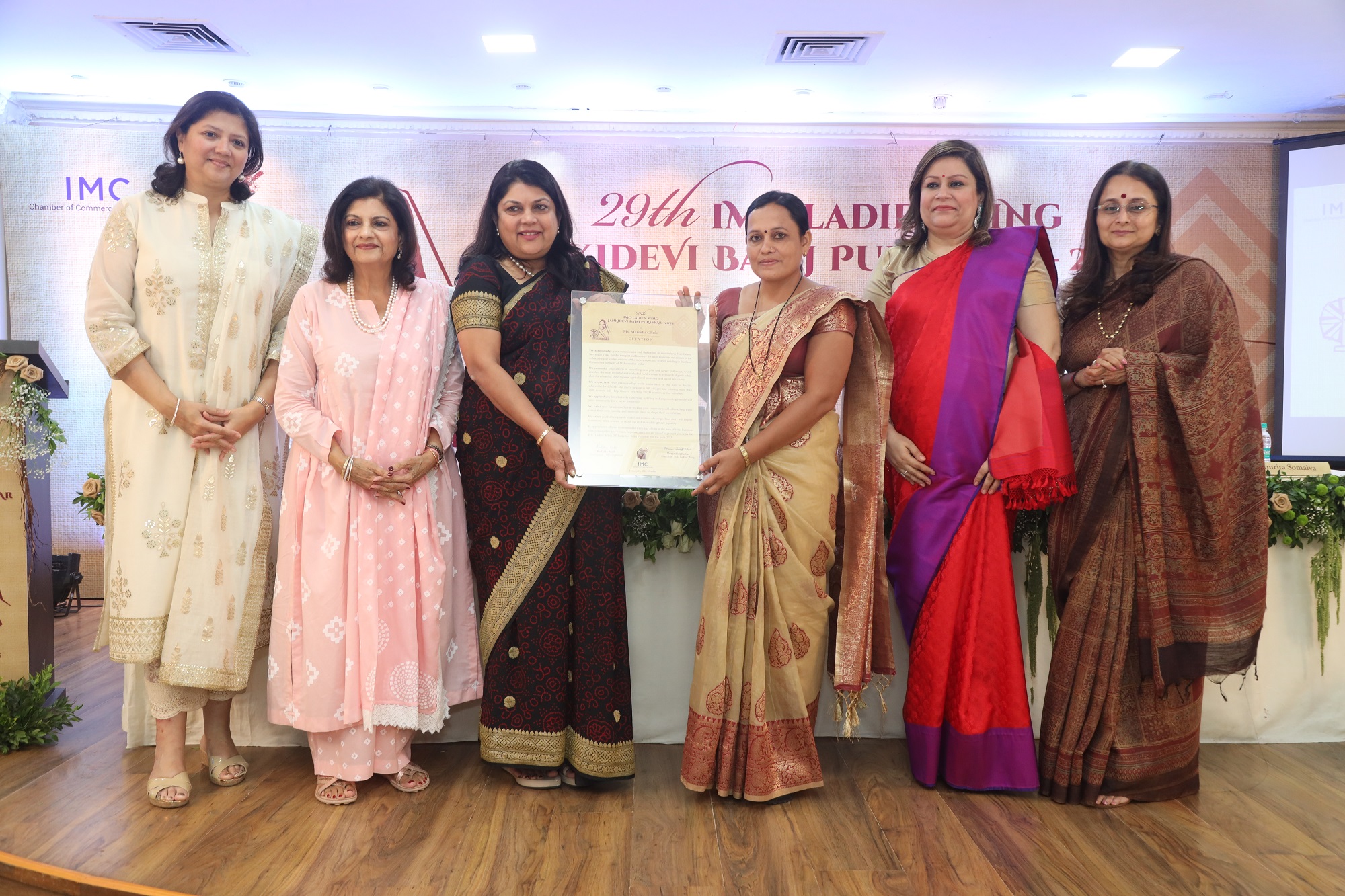 2022 Ms. Manish Ghule, receiving 29th IMC LW Jankidevi Bajaj Puraskar-2022 from Chief Guest Smt. Falguni Nayar, Founder and CEO – ‘Nykaa’, (L to R) Priyadarshini Kanodia, Co-Chairperson, 29th JBP Committee, Smt. Radhika Nath, Chairperson, 29th JBP Committee, Smt. Falguni Nayar, Founder and CEO – ‘Nykaa’, Ms. Manisha Ghule - Executive Director, Navchetana Sarvangin Vikas Kendra, Smt. Roma Singhania-President, IMC Ladies’ Wing and Smt. Amrita Somaiya-Vice President, IMC Ladies’ Wing.
