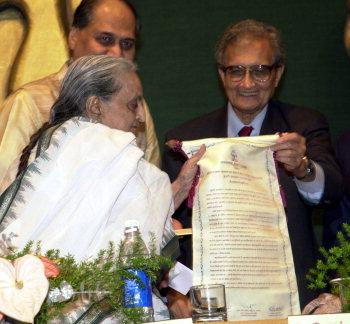 Arunaben Desai receiving the 2005 Jamnalal Bajaj Award for upliftment of women & children at the hand of Prf. Amartya Sen. Chairman of Bajaj Auto Limited Rahul Bajaj is also seen