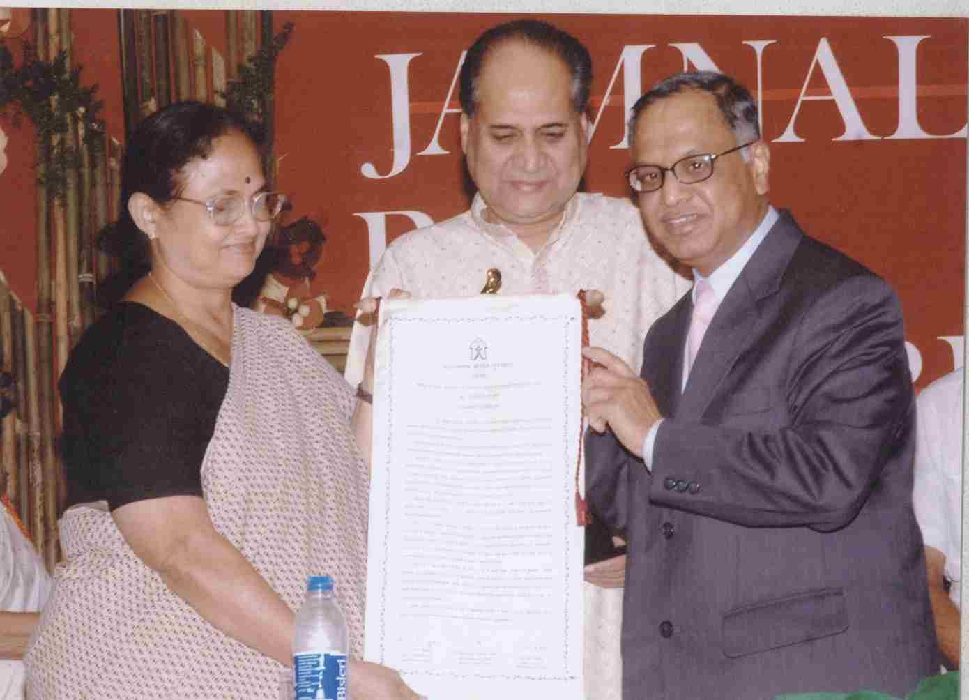 Dr. (Smt) Rani Abhay Bang receiving Jamnalal Bajaj Award for the year 2006 at the hands of Shri N.R. Narayana Murthy, Chairman and Chief Mentor, Infosys Technologies Ltd