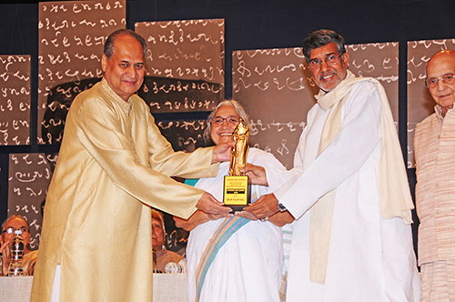 Smt. Chennupati Vidyya receiving the award at the hands of Nobel Peace Prize winner Shri Kailash Satyarthi.