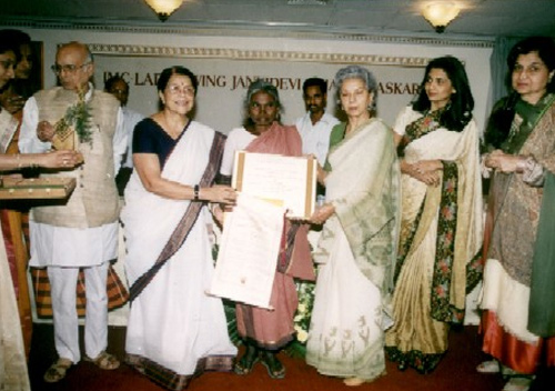 2000 Smt. Chinnapillai receiving the 8th IMC Ladies' Wing Jankidevi Bajaj Puraskar-2000 from Smt. Sumitra G. Kulkarni. Justice C.S.Dharmadhikari, Chairman, Panel of Judges, Smt. Indira Mahindra, Chairperson, Awards Sub-Committee and Smt. Gauri Pohoomal, President IMC Ladies Wing looks on.
