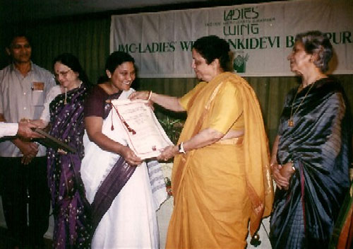 1996 Smt. Saraswathi Gora recipient of the 4th IMC-Ladies’ Wing Jankidevi Bajaj Puraskar- 1996, (being received by her daughter) from Smt. Usha Kiran, Sheriff of Mumbai. Smt. Nalini Bhagwati, President IMC Ladies’ Wing and Smt. Indira Mahindra, Chairperson, Awards Sub-Committee looks on