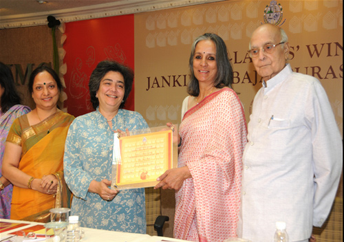 2010 Smt. Anita Paul receiving 18th IMC-LW Jankidevi Bajaj Puraskar-2010 from Smt. Zia Mody, Sr. Partner, AZB & Partners. Smt. Smita Dandekar, President, LW-IMC and Justice C.S. Dharmadhikari (Retd.), Chairman, Panel of Judges looks on.