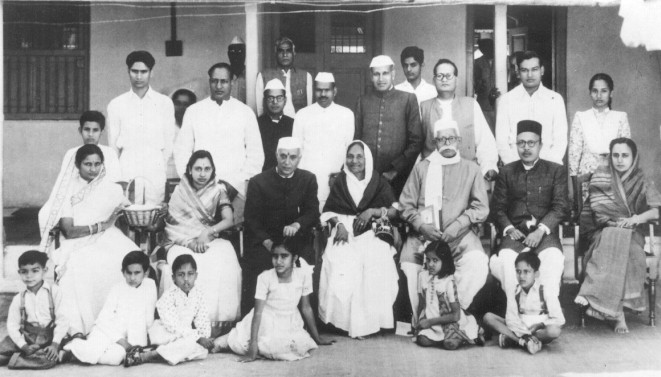 Pandit Jawaharlal Nehru, Ravishankar Shukla and Bajaj family at Bajajwadi, Wardha.