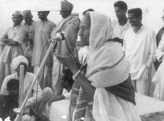 Addressing farmers at Vinoba Bhave's Bhoodan yatra in Rajasthan.