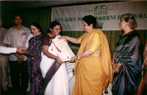 RECIPIENT - Smt. Saraswati Gora (1996) [Her Daughter receives the award on her behalf] OUTSTANDING CONTRIBUTION - A veteran freedom fighter who participated in the 'Quit India' movment has been a life-long fighter for the cause of social change on Gandhian lines. Founder of 'Atheist Centre', Andhra Pradesh engaged in counselling and sheltering women with social problems such as widows, deserted and un-wed mothers, etc. Fought for abolition of Zamindaris and Jogini system and encouraged women to develop scientific and rational outlook.