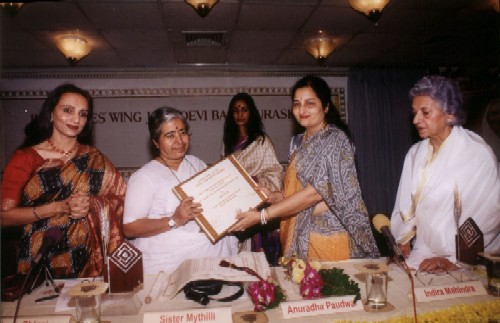 RECIPIENT - Sister Mythilli (1999) OUTSTANDING CONTRIBUTION - Driving force behind 2 small-scale industries - 'Daya' and 'Hridaya' - hitech units in Trivandrum producing bio-medical devices generating employment to women. Has worked relentlessly for the socio-economic, spiritual, mental and emotional development of rural women. Opened a home called 'Shaktimandiram' to shelter and rehabilitate women and children in distress and impart a concept of 'earn and learn' to make them independent.