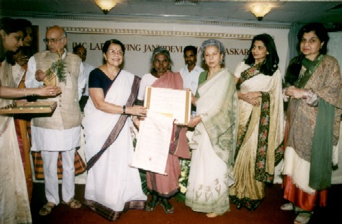 RECIPIENT - Smt. Chinnapillai (2000) OUTSTANDING CONTRIBUTION - Landless agricultural labourer from Madurai is the Founder Executive Committee member of 'Kalanjiam' savings credit and self-help movement of poor women. She has led many successful struggles to establish rights and entitlement of poor women and fought against corrupt politicians, officials, landlords and money lenders, etc.