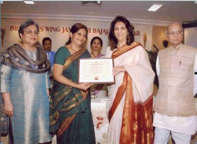 Smt Chetna Gala Sinha was Conferred the coveted Jankidevi Bajaj Puraskar for the year 2005 by Dr. Indu Shahani.President of IMC-Ladies’ Wing Dr. Meenal Kapadia looks on.