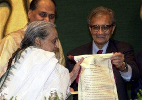 Smt. Arunaben S. Desai receiving the award at the hands of Nobel Laureate Prof. Amartya Sen.