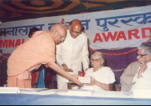 Smt. Indirabai Halbe receiving award at the hands of Swami Ranganathananda.