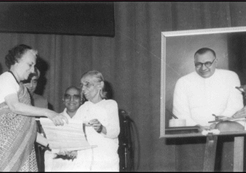 Smt. Tarabai Mashruwala receiving award at the hands of Hon. Smt. Indira Gandhi, Prime Minister of India.