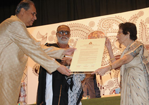 Smt. Shobhana Ranade receiving the award at the hands of Pujya Morari Bapu.