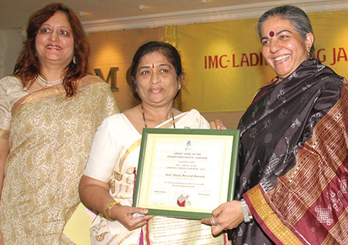 Mrs. Shaila Amrute receiving 15th IMC ladies Wing Jankidevi Bajaj Puraskar 2007 from Dr. Vandana Shiva, Director, Research Foundation for Science, Technology and Ecology. Smt. Minal Bajaj, President IMC-Ladies Wing looks on.