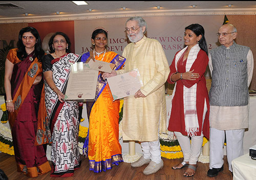 2012 Smt. Josephine Selvaraj receiving 20th IMC-Ladies Wing Jankidevi Bajaj Puraskar - 2012 from Shri Gerson da Cunha, noted Advtg. & Theatre Personality & Social Activist. Smt. Amita Haribhakti, Chairman-Awards Sub Committee, Smt. Darshana Doshi, President – LW, Smt. Nandita Das, Award Winning Film Actor & Social Activist and Dr. Justice C.S. Dharmadhikari, Chairman Awards Committee looks on.