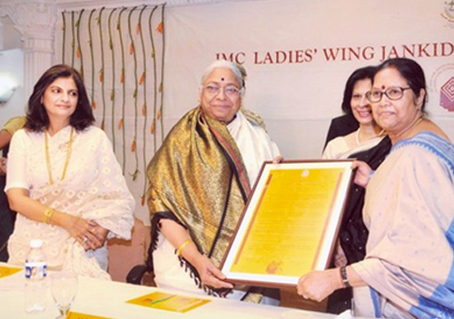 Smt.Pushpa Chopra receiving 17th IMC-LW Jankidevi Bajaj Puraskar-2009 from H.H. Smt. Prabha Rau, Governor, Himachal Pradesh. Smt. Sheila Kripalani, President, Ladies Wing and Smt. Radhika Nath, Chairperson, Award Sub-Committee looks on.